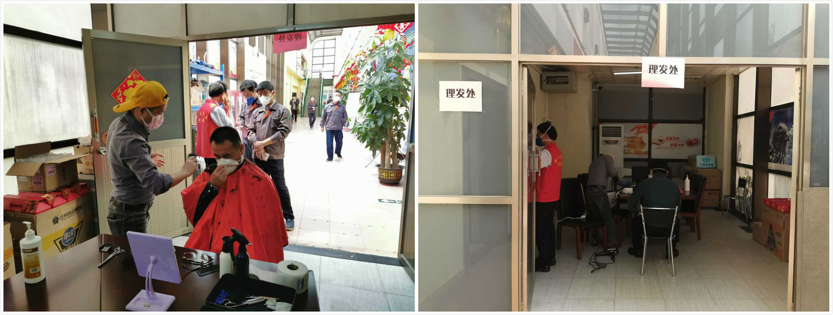 考虑到目前仍处于疫情防控的关键阶段,我们的理发师傅需要经过测量体温、查询行动轨迹、戴口罩、签署承诺书等一系列消杀防疫工作才能进入园区;同时为了避免人群聚集,各地园区会根据人流情况,组织员工错峰前往指定地点理发。