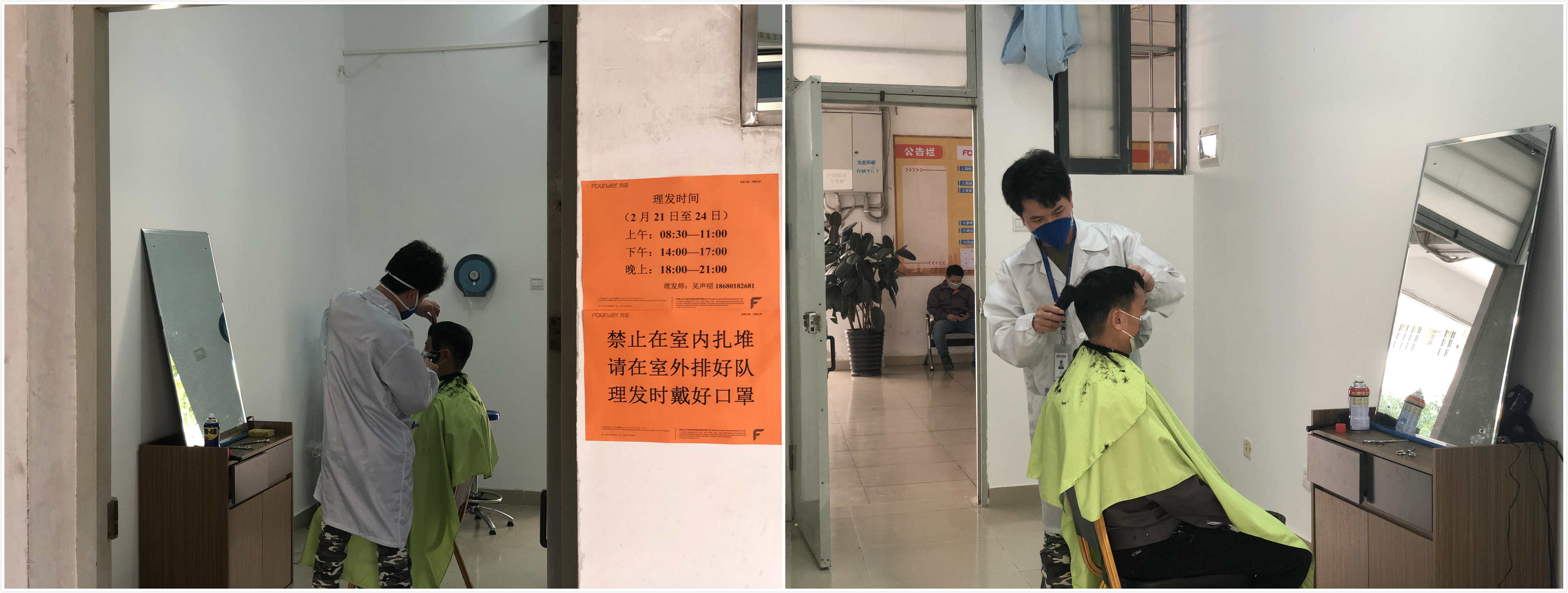 富山园区和重庆园区也马上响应。富山园区的爱心理发屋当天下午就正式成立,重庆园区也计划利用周末的时间开展免费理发活动,值得一提的是,这两个园区的理发师是来自我们产线的一线员工,他们在成为方正的员工之前曾经是专业的理发师,在此次活动中他们利用业余时间为同事们进行爱心免费理发,发扬大爱精神,为奋斗在复工复产一线的员工做好后勤保障工作。