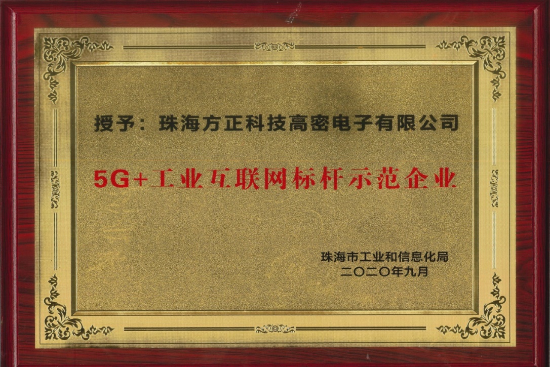 大会现场由珠海市工信局对12家入围2020年珠海市5G+工业互联网标杆示范项目的企业进行了现场授牌,方正高密获此殊荣。