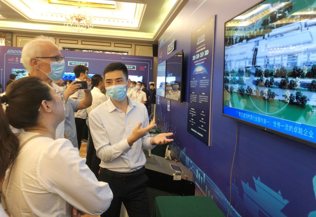 大会现场设置了多个5G+工业互联网的可视化展台,如5G+工业数字化(珠海高密)、5G+数字码头、5G+工业视觉、5G+新能源、5G工业模组等应用场景,方正PCB的数字化工厂展台吸引了场内众多企业家和行业专家的目光,公司同事热情为驻足嘉宾介绍方正PCB数字化工厂的相关情况,相互交流与探讨5G+工业互联网技术在PCB行业的应用与未来发展设想。